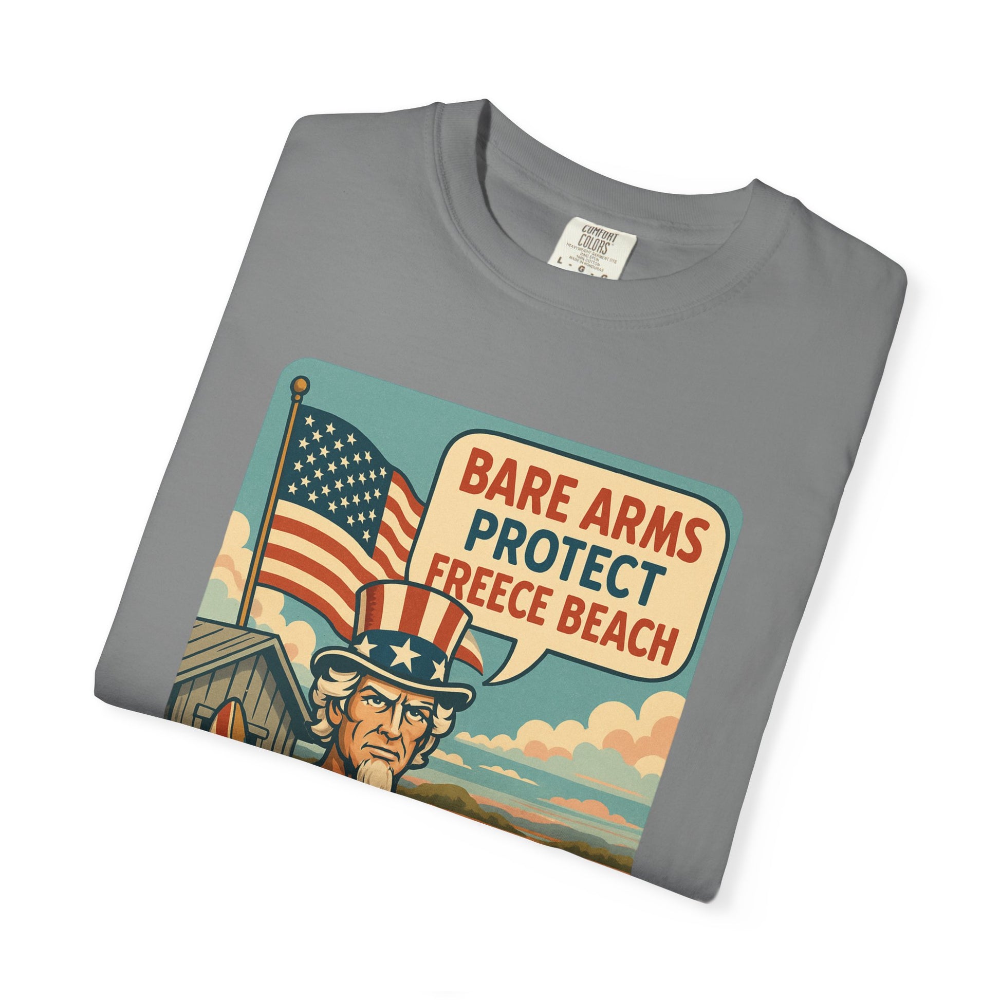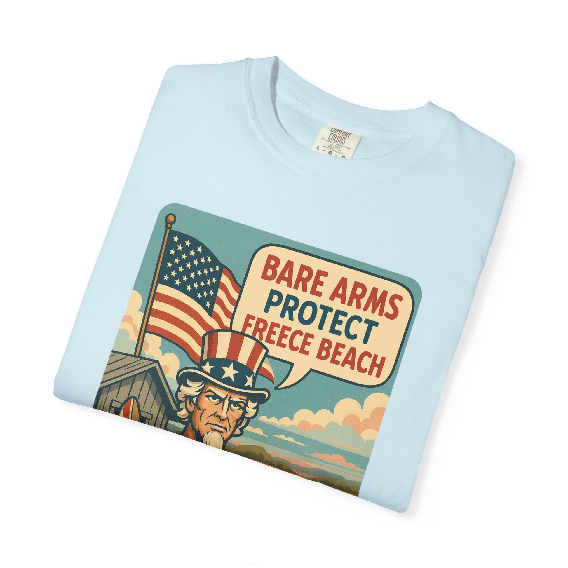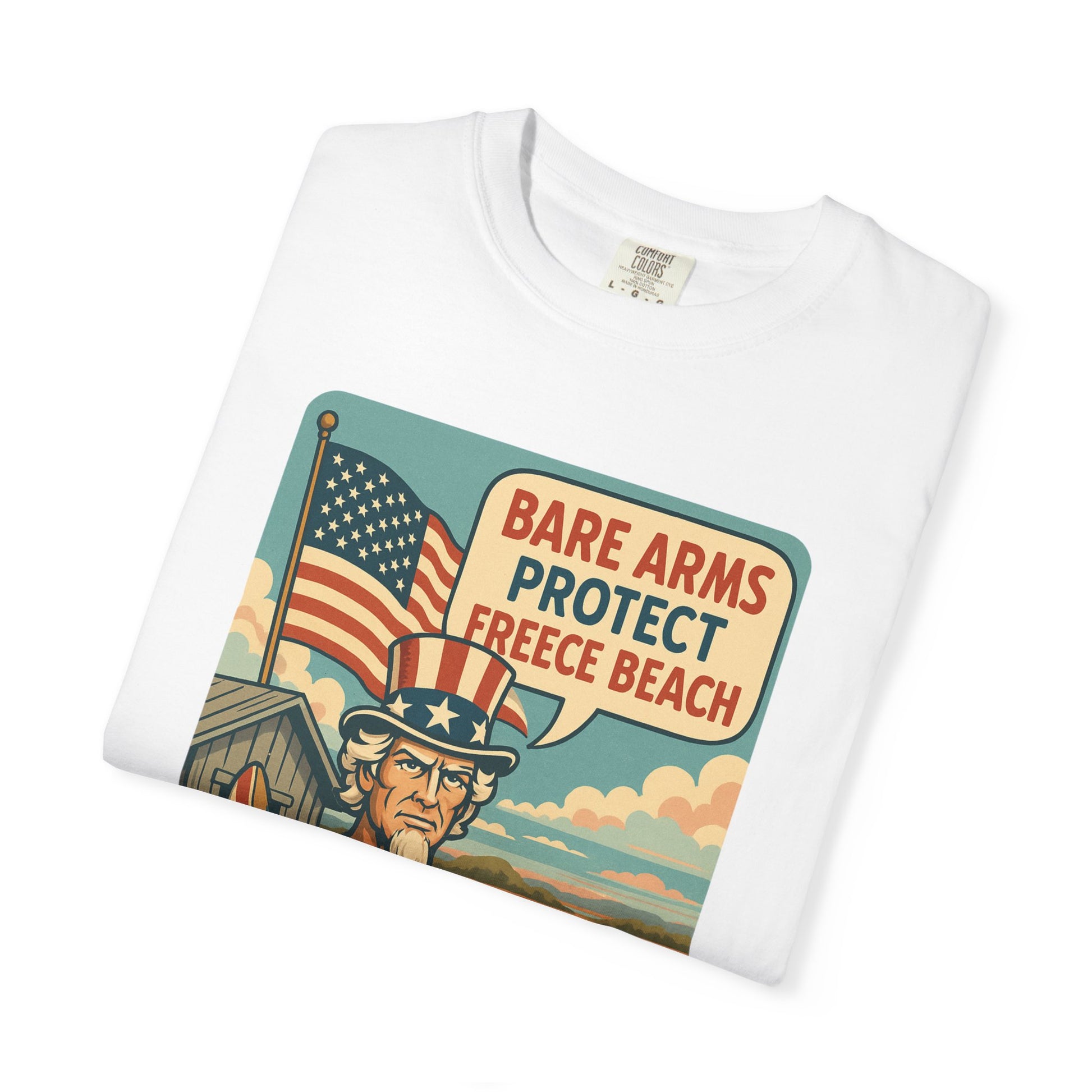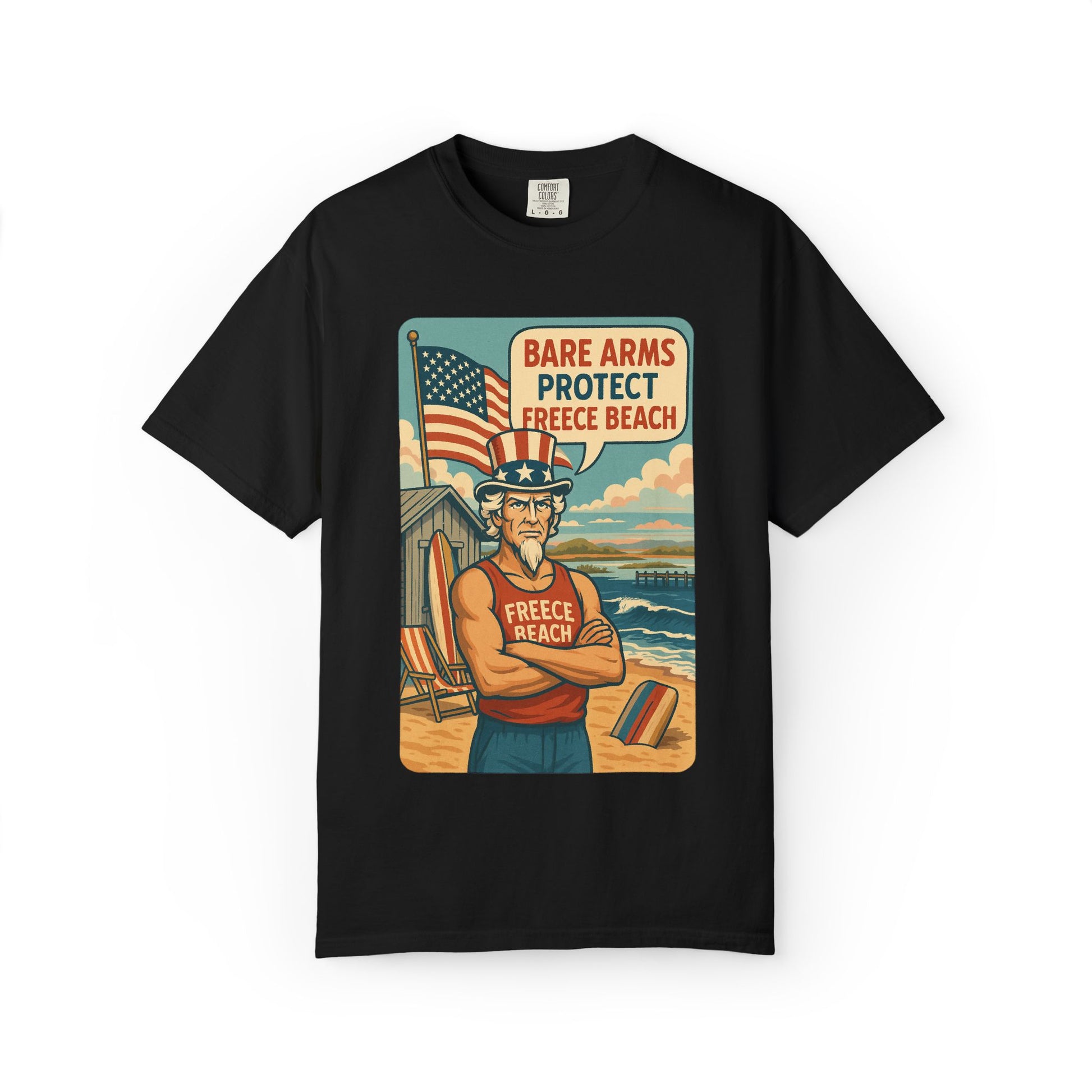 A bold, vintage-style patriotic illustration reimagining Uncle Sam as a beachside guardian, blending Americana pride with coastal attitude as he stands watch over Freece Beach.