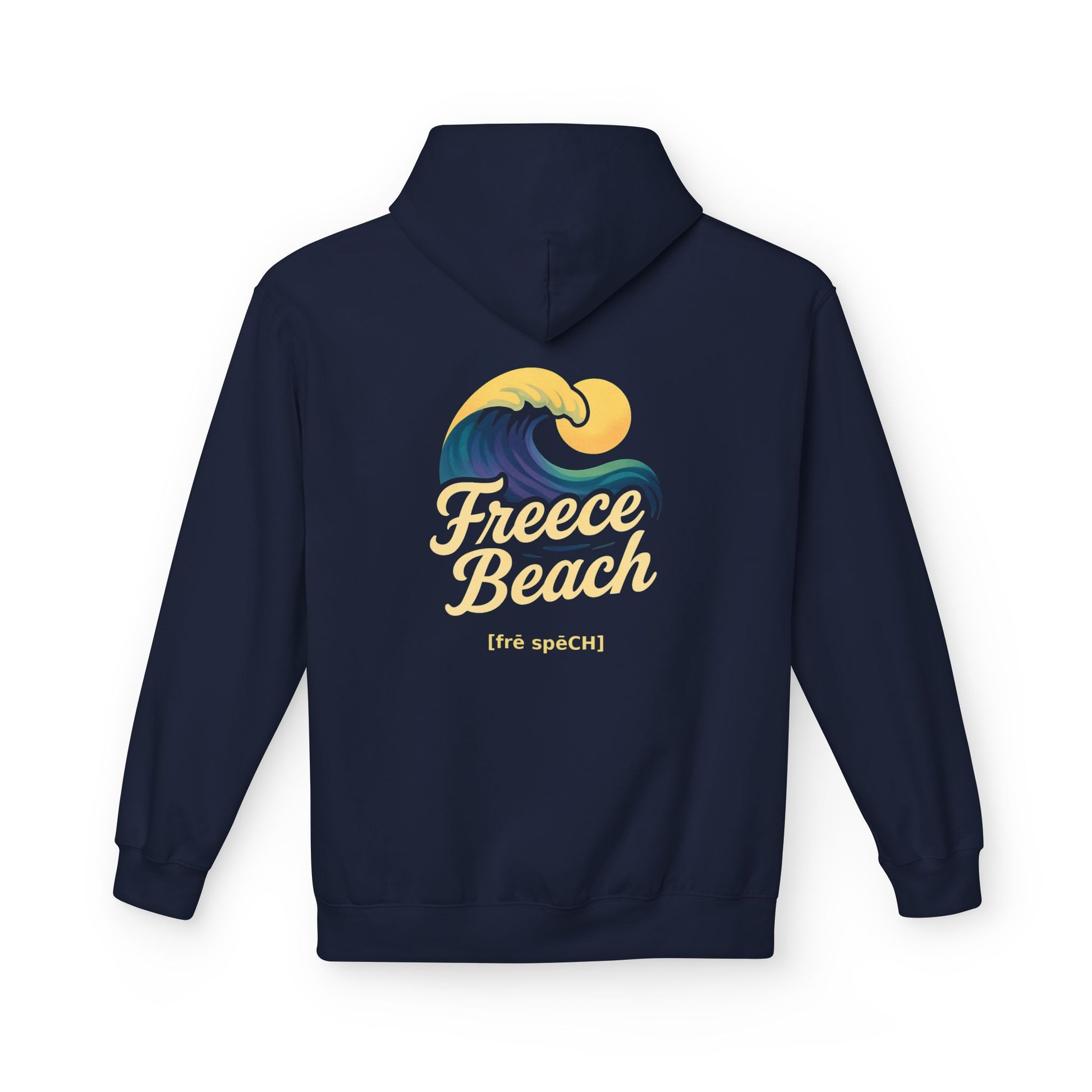 The Midnight Wave Freece Beach Hoodie features a glowing crescent wave under a golden night sky, paired with the official Freece Beach cursive mark. Deep ocean tones and smooth gradients give it a timeless, after-dark surf vibe—perfect for cool nights, late rides, and anyone who moves with the tide rather than the crowd.