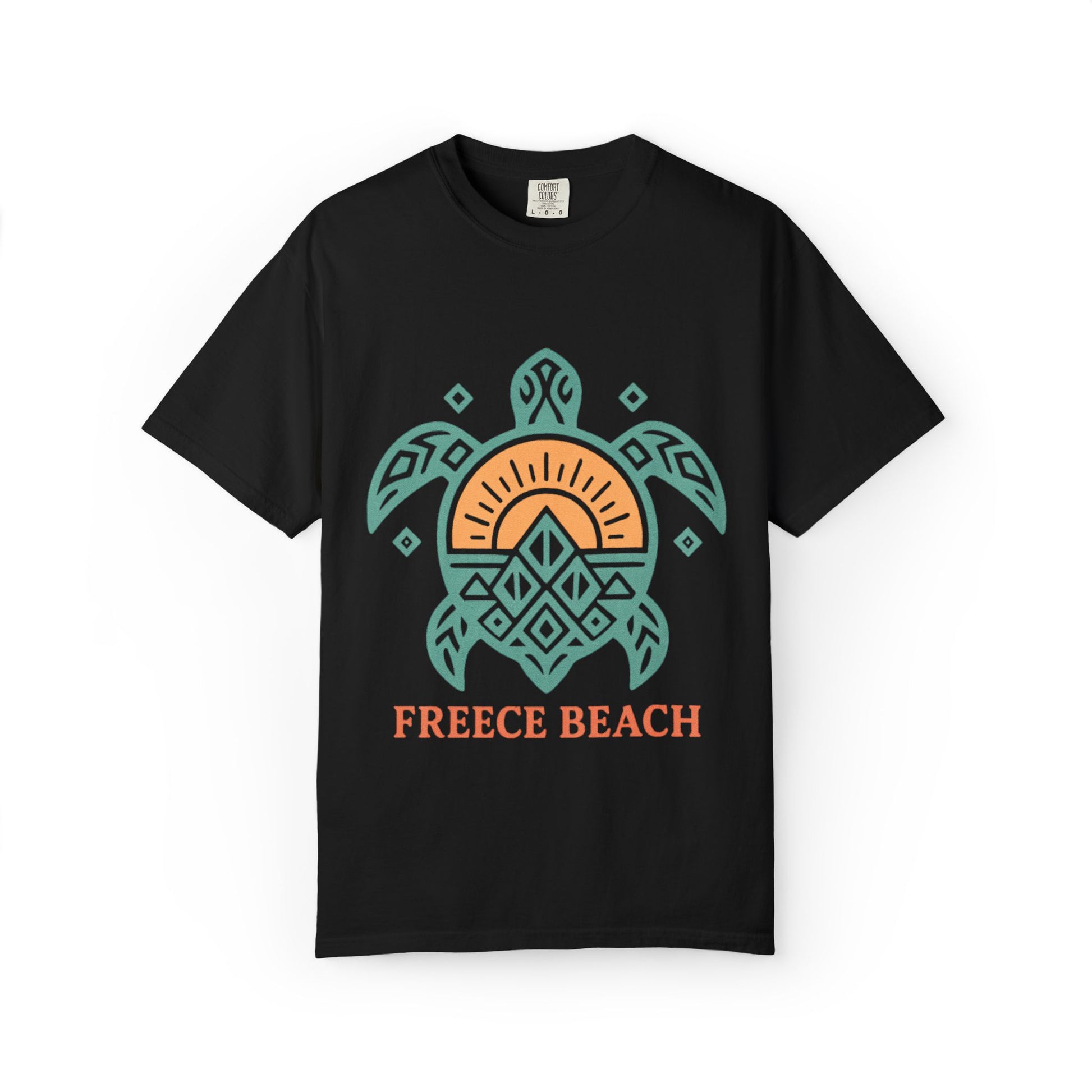 Celebrate coastal spirit and timeless island heritage with the Freece Beach Turtle Emblem Tee. This front-printed design features a stylized sea turtle infused with tribal and geometric patterns, symbolizing wisdom, endurance, and harmony with nature. At its heart, a radiant sunrise emerges over a diamond-patterned shell—an emblem of hope, balance, and the Freece Beach way of life.